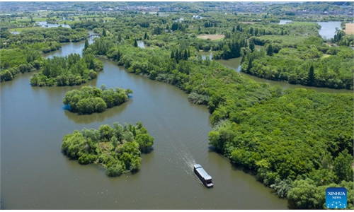 An aerial drone photo taken on May 16, 2024 shows a view of the Baita Lake national wetland park in Zhuji City, east China's Zhejiang Province. In recent years, Baita Lake national wetland park has implemented ecological restoration projects to improve the wetland ecological environment and promote the harmonious co-existence between man and nature.(Photo: Xinhua)