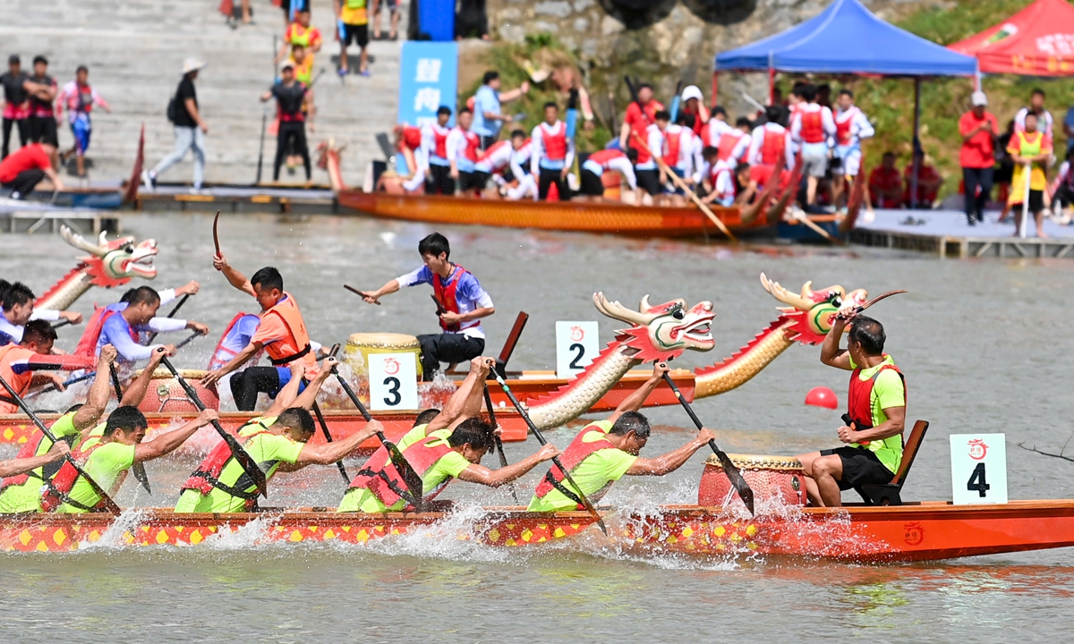 People take part in a dragon boat race in Daoxian county, Hunan Province, on June 2, 2024. Photo: VCG