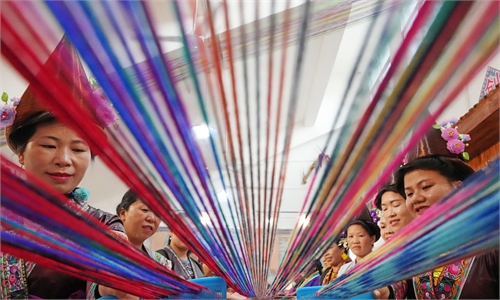 Local villagers produce embroidery in Bijie, Southwest China's Guizhou Province on June 16, 2024. The village, where a majority of residents are from Miao ethnic groups, has become a travel hotspot as village tourism booms. Miao embroidery has also gained popularity, which not only preserves local culture but also raises villagers' incomes. Photo: VCG