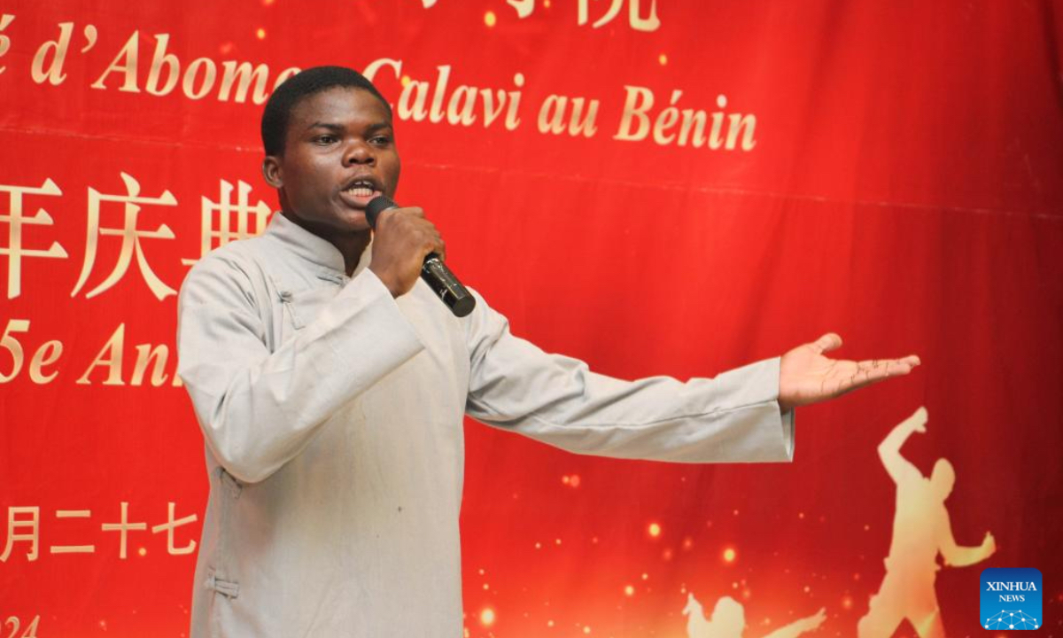 A student performs Chinese poetry recitation during the 15th anniversary of the Confucius Institute of the University of Abomey-Calavi at Chinese Cultural Center in Cotonou, Benin, June 27, 2024. (Photo: Xinhua)