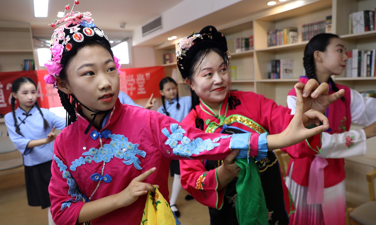 Children learn to sing Lüju Opera under the guidance of local folk artists in Boxing county, Binzhou, East China's Shandong Province, on July 4, 2024. Boxing county is the birthplace of Lüju Opera. During summer vacation, various communities invite local folk artists to provide free guidance to local children in learning about traditional culture and experiencing its charm. Photo: VCG