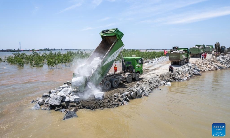 An aerial drone photo shows rescuers working to block the dike breach in the Dongting Lake in Huarong County, central China's Hunan Province, July 7, 2024. (Xinhua/Chen Zeguo)