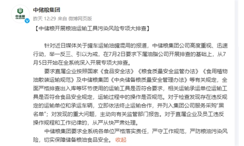 On Saturday, China Grain Reserves Oil and Fat (Tianjin), a subsidiary of the China Grain Reserves Management Group Sinograin, announced on social media that they have initiated a comprehensive investigation throughout their entire system.