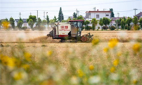 Harvesters work during an activity organized by the local goverment to demonstrate agricultural machines in Caigongzhuang Township in North China's Tianjin. Summer harvest in north China's Tianjin has begun. Modern agricultural technology and machinery have been applied in the region to help local farmers increase yield and attain a bumper harvest. Photo: Xinhua