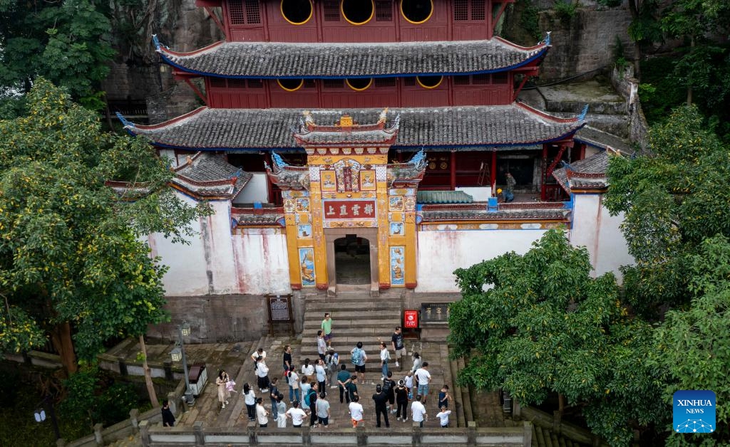 A drone photo taken on July 10, 2024 shows people visiting the Shibaozhai, a scenic spot in Zhongxian County, southwest China's Chongqing. Shibaozhai looks like a heart-shaped bonsai sitting in the middle of Three Gorges section of Yangtze Rier. It is home to a 12-story, 56-meter wooden pagoda that stands on 20 pillars and leans against the cliff. This structure dated back to the Ming Dynasty (1368-1644) serves as a leading tourist attraction of Shibaozhai. (Photo: Xinhua)