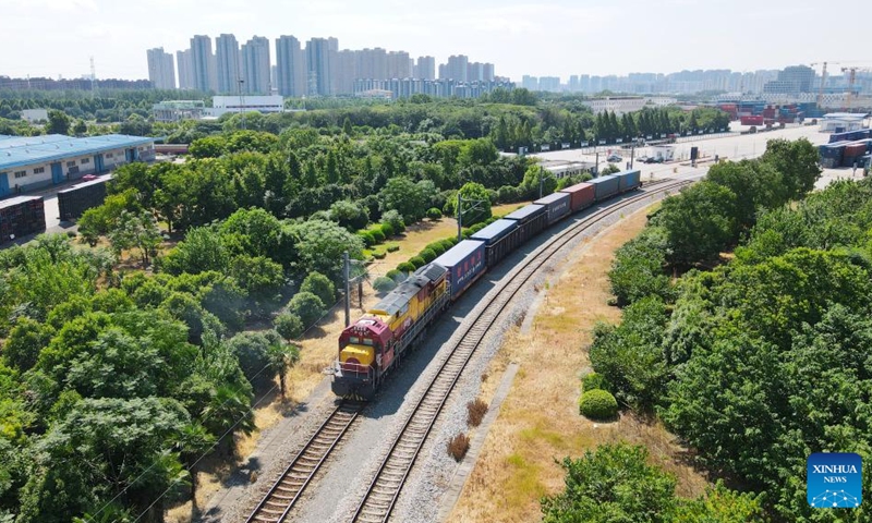 This aerial drone photo taken on Aug. 1, 2024 shows a China-Europe freight train departing from the logistics base of Hefei north railway station in Hefei, east China's Anhui Province. A total of 380 China-Europe freight trains departing from Hefei between January and July this year, marking a 3 percent increase from the previous year. Photo: Xinhua