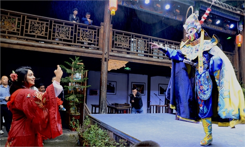 A visitor films a performance of bian lian, or face-changing, on May 8, 2023 in Guangyuan, Southwest China’s ...