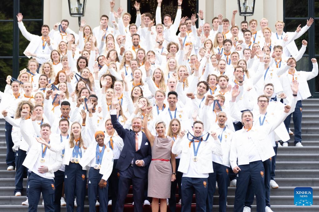 Dutch King Willem-Alexander (front, 3rd R) and Queen Maxima (front, 2nd R) pose with the Dutch Olympic medalists after they returned from the Paris 2024 Olympic Games at the Huis ten Bosch Palace in The Hague, the Netherlands, on Aug. 13, 2024. Team Netherlands won 15 gold medals and a historic sixth place on the gold medal table at the Paris 2024 Olympic Games, marking the country's best-ever performance at a Summer Games. (Photo: Xinhua)
