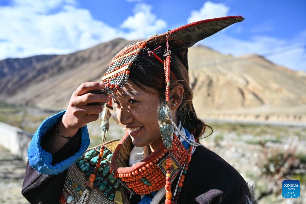 A villager displays folk costume in Kejia Village of Pulan County, southwest China's Xizang Autonomous Region, Sept. 9, 2024. Originating in Pulan County, Pulan folk costume has been a traditional garment worn at celebrations for over a millennium. Weighing more than 20 kilograms, a piece of this unique costume is usually decorated with rare metals and jewels, like gold, silver, beeswax, coral and turquoise. (Photo: Xinhua)