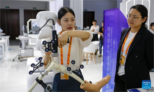 Visitors interact with a robot during the 2024 China International Fair for Trade in Services (CIFTIS) at the China National Convention Center in Beijing on September 13, 2024. Themed "Global Services, Shared Prosperity," this year's CIFTIS lays greater emphasis on its global vision, professionalism, and market orientation as well as its role as a trade facilitator. Photo:Chen Tao/GT