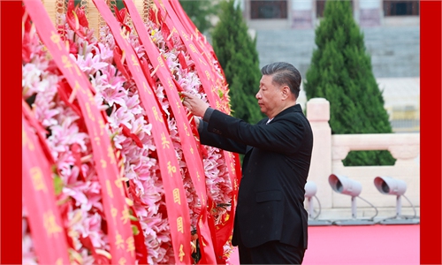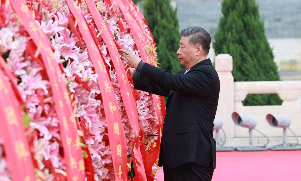 Xi Jinping straightens the ribbon on a flower basket during a ceremony to present flower baskets to fallen heroes at Tian'anmen Square in Beijing, capital of China, Sept. 30, 2024. (Photo: Xinhua)