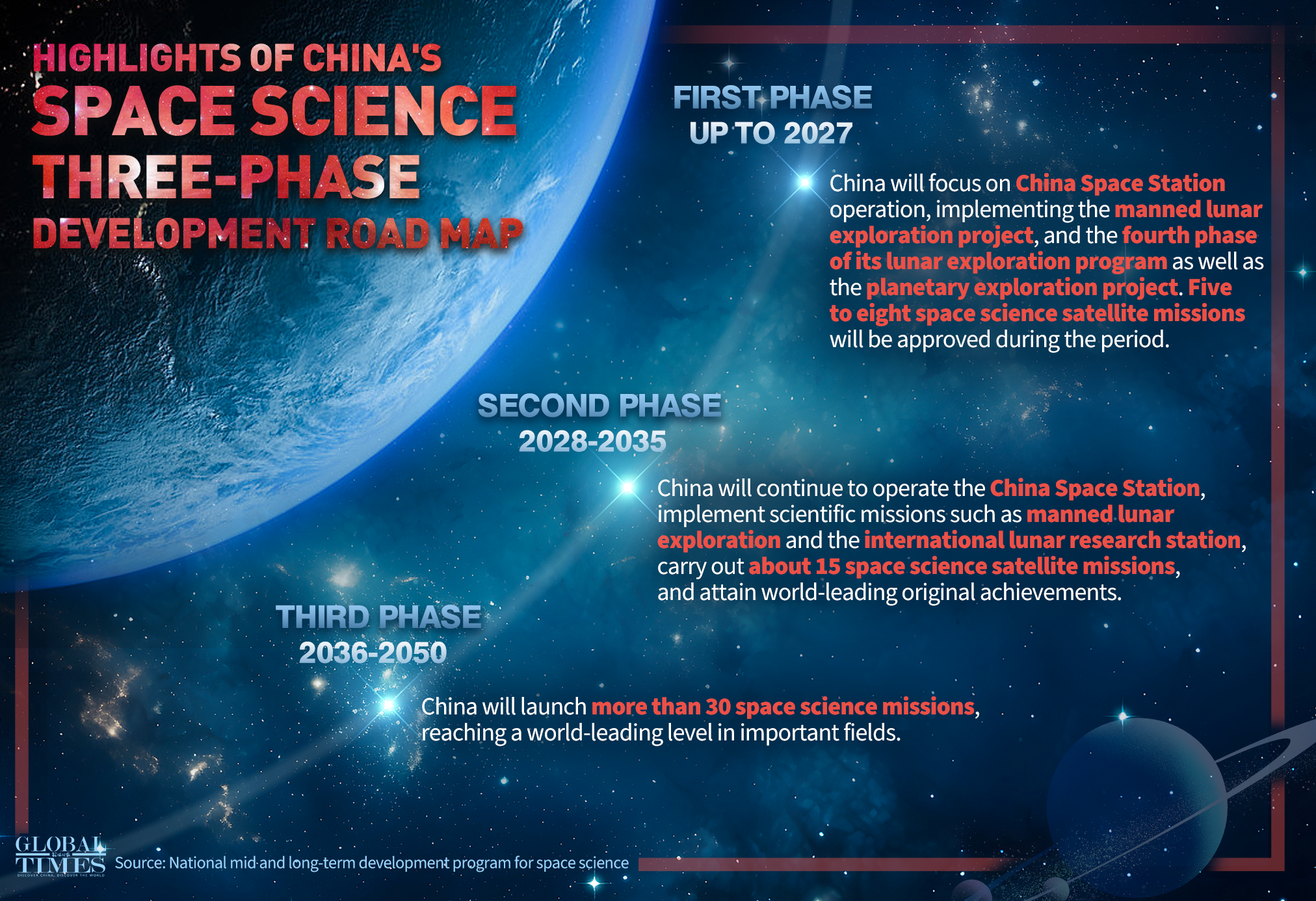 And by the third stage from 2036 to 2050, China's key areas of space science will reach world-leading levels. During this period, five to six major missions will be implemented, along with around 25 medium-to-small scale and opportunity-based missions.