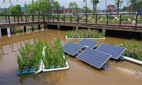 Solar panels erected above the water are seen in Changxing township, East China's Zhejiang Province, on October 24, 2024. In recent years, Changxing has utilized river ponds, reservoirs, abandoned mines and barren land to construct water-based and ground photovoltaic power generation facilities, combining fish farming and agriculture under the panels, which provided economic and ecological benefits. Photo: VCG