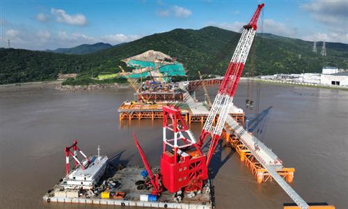 An aerial view of the Huajiang Grand Canyon Bridge in Southwest China's Guizhou Province on October 24, 2024. Construction of the bridge, with a designed height of 625 meters between the bridge deck and the Beipanjiang River below, began in 2022. It's set to be the highest in the world after it is completed in 2025, the Xinhua News Agency reported. Photo: VCG