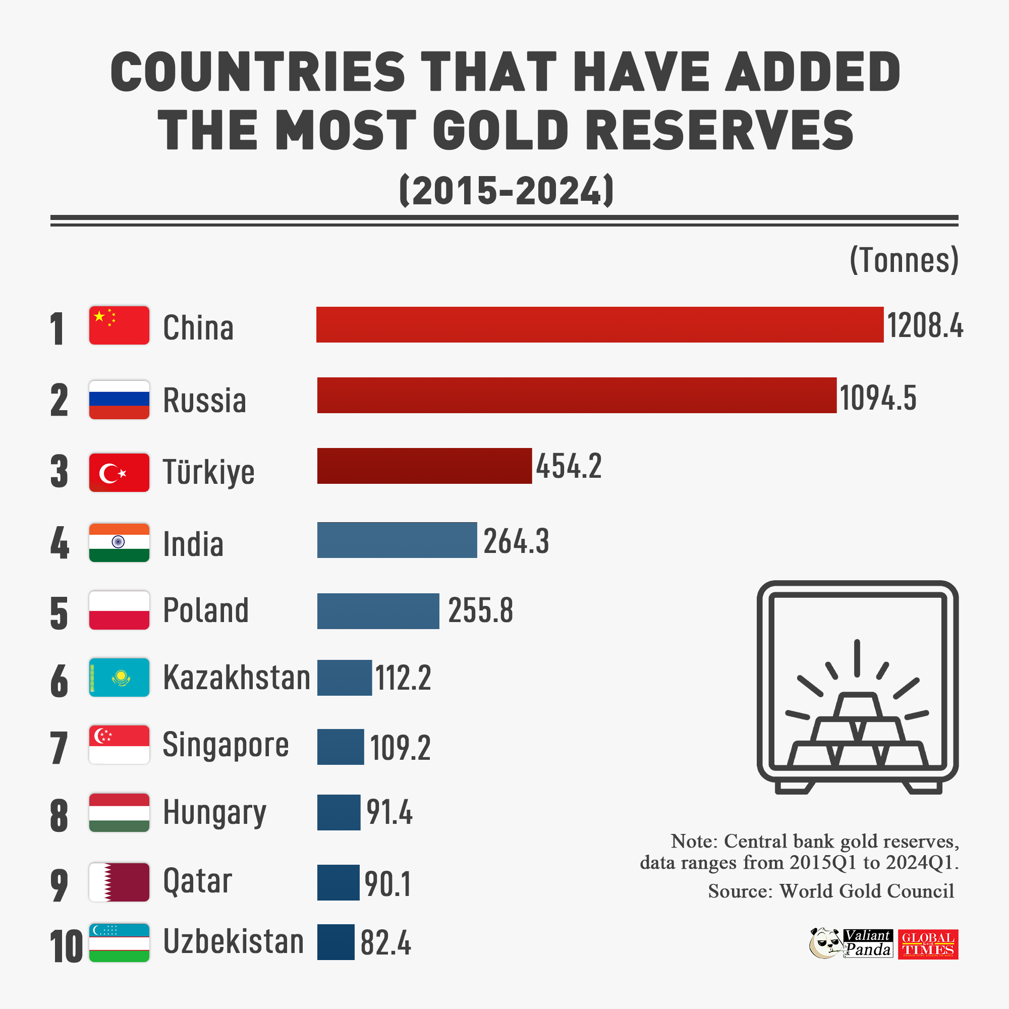 Countries that have added the most gold reserves (2015-2024)