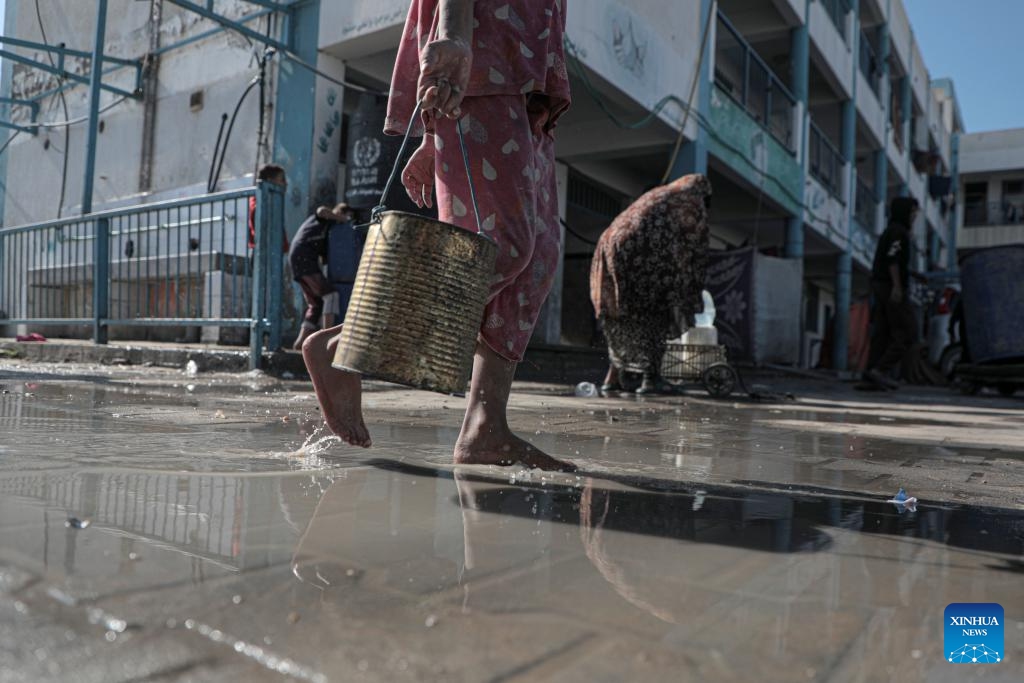 People fetch water at a shelter affiliated with the United Nations Relief and Works Agency for Palestine Refugees in the Near East (UNRWA) in the southern Gaza Strip city of Khan Younis, on Oct. 29, 2024. UN Secretary-General Antonio Guterres on Tuesday sent a letter to Israeli Prime Minister Benjamin Netanyahu, expressing his concerns over the new legislations that banned a UN agency's operations, a UN spokesperson said. (Photo: Xinhua)