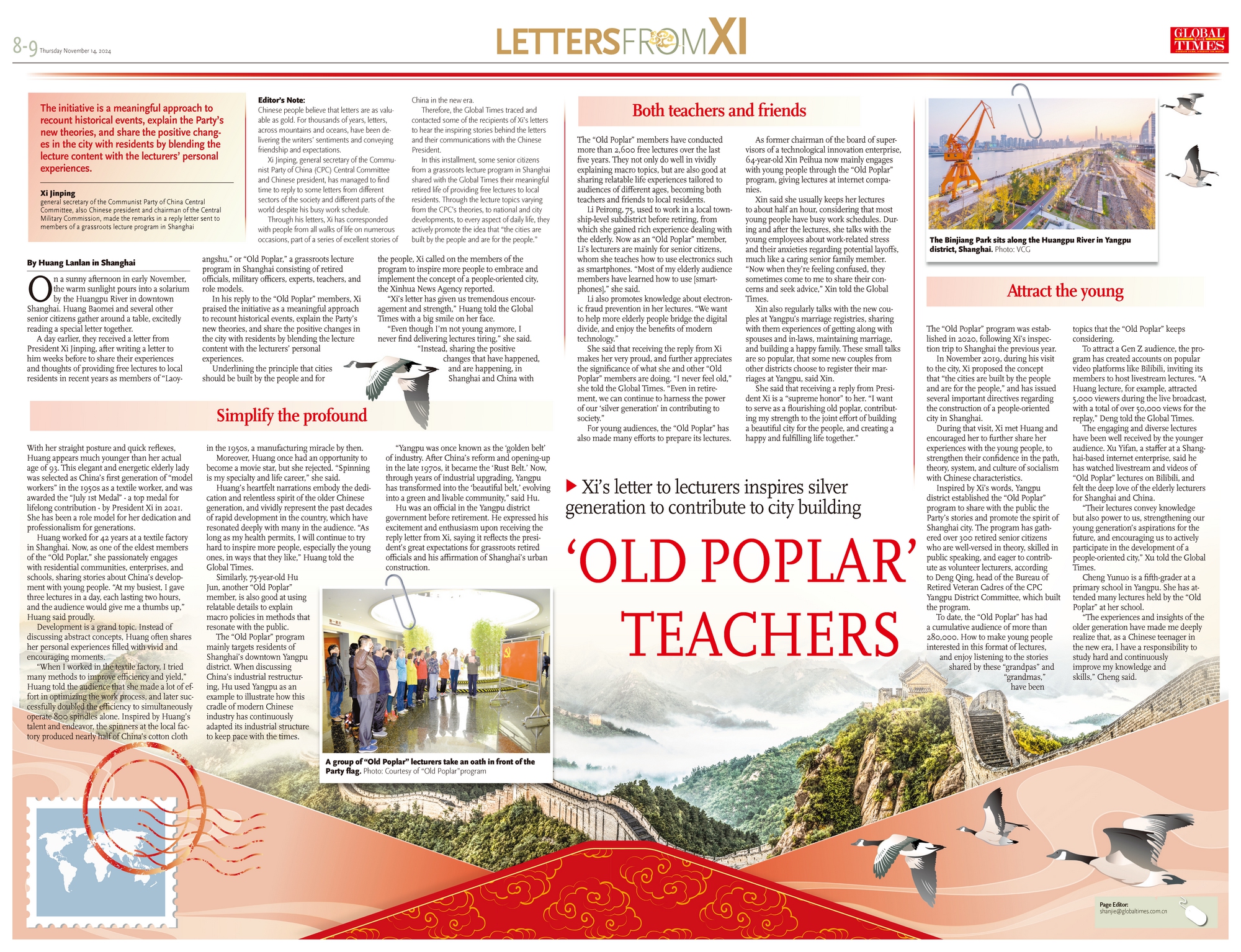 A day earlier, they received a letter from President Xi Jinping, after writing a letter to him weeks before to share their experiences and thoughts of providing free lectures to local residents in recent years as members of "Laoyangshu," or "Old Poplar," a grassroots lecture program in Shanghai consisting of retired officials, military officers, experts, teachers, and role models.