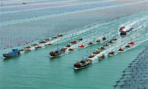 Workers load and transport abalone fry in a marine ranch in Rongcheng city, East China's Shandong Province on November 13, 2024. According to preliminary calculations, China's gross ocean product grew 5.4 percent year-on-year to 7.7 trillion yuan ($1.08 trillion) in the first three quarters of this year. Photo: VCG