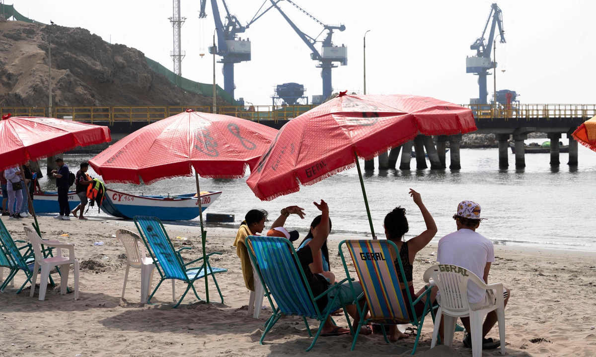 Residents relax and enjoy the beach under the sun, as cranes build Chancay Port in the background in Lima, Peru, on October 29, 2024. Photo: VCG