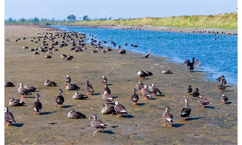 A large number of winter migratory birds, including geese and ducks, arrive at the Dongtai Sliver Mud Wetland ...