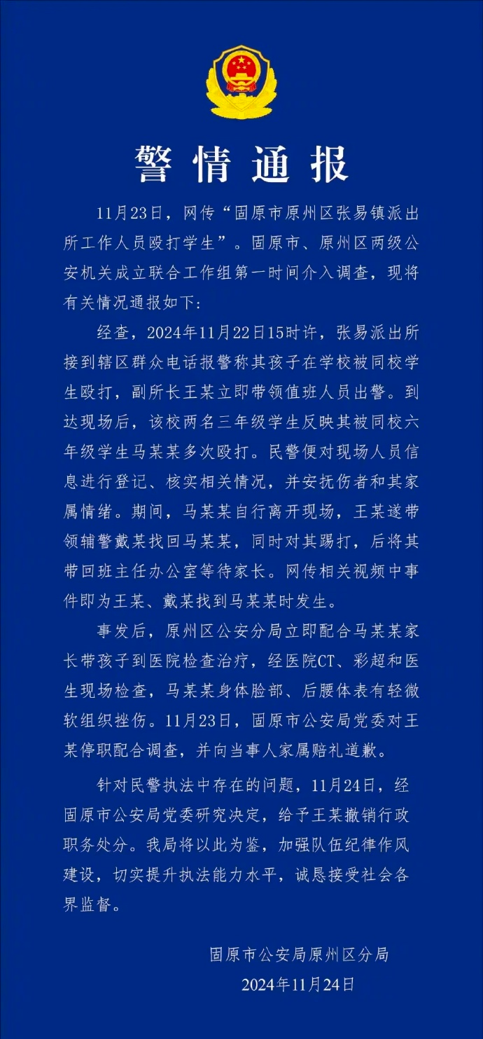 Following the incident, the local public security bureau of Yuanzhou district assisted Ma's parents in taking him to hospital for examination and treatment. According to hospital CT scans, ultrasounds, and an on-site examination by a doctor, Ma sustained mild soft tissue contusions on his face and lower back. On Saturday, the Guyuan police bureau suspended Wang's duty, and issued a apology to Ma's family.