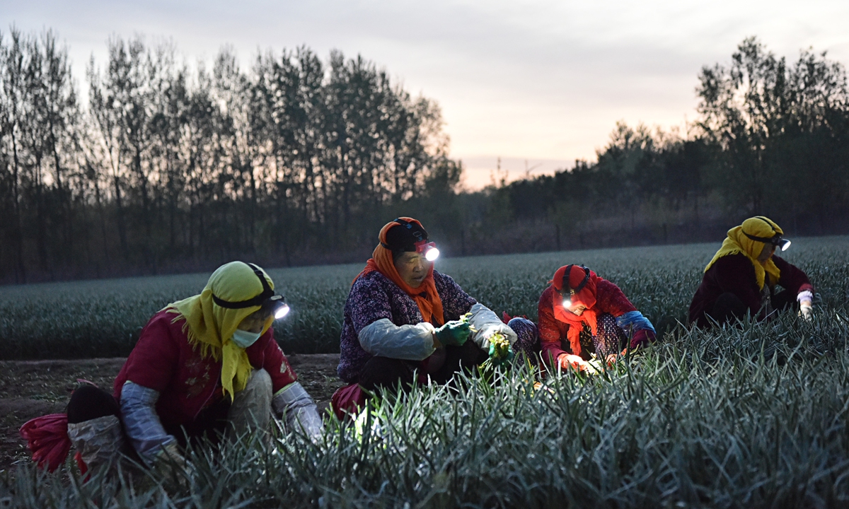 Villagers wear headlights while harvesting leeks in a vegetable field in a village in Weifang, East China's Shandong Province, on April 17, 2024. Photo: VCG