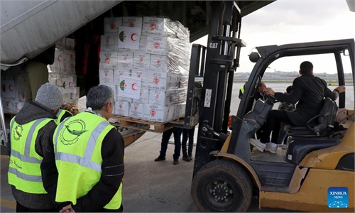 Humanitarian aid supplies from Algeria are unloaded at the international airport in Aleppo, northern Syria, on Feb. 7, ...