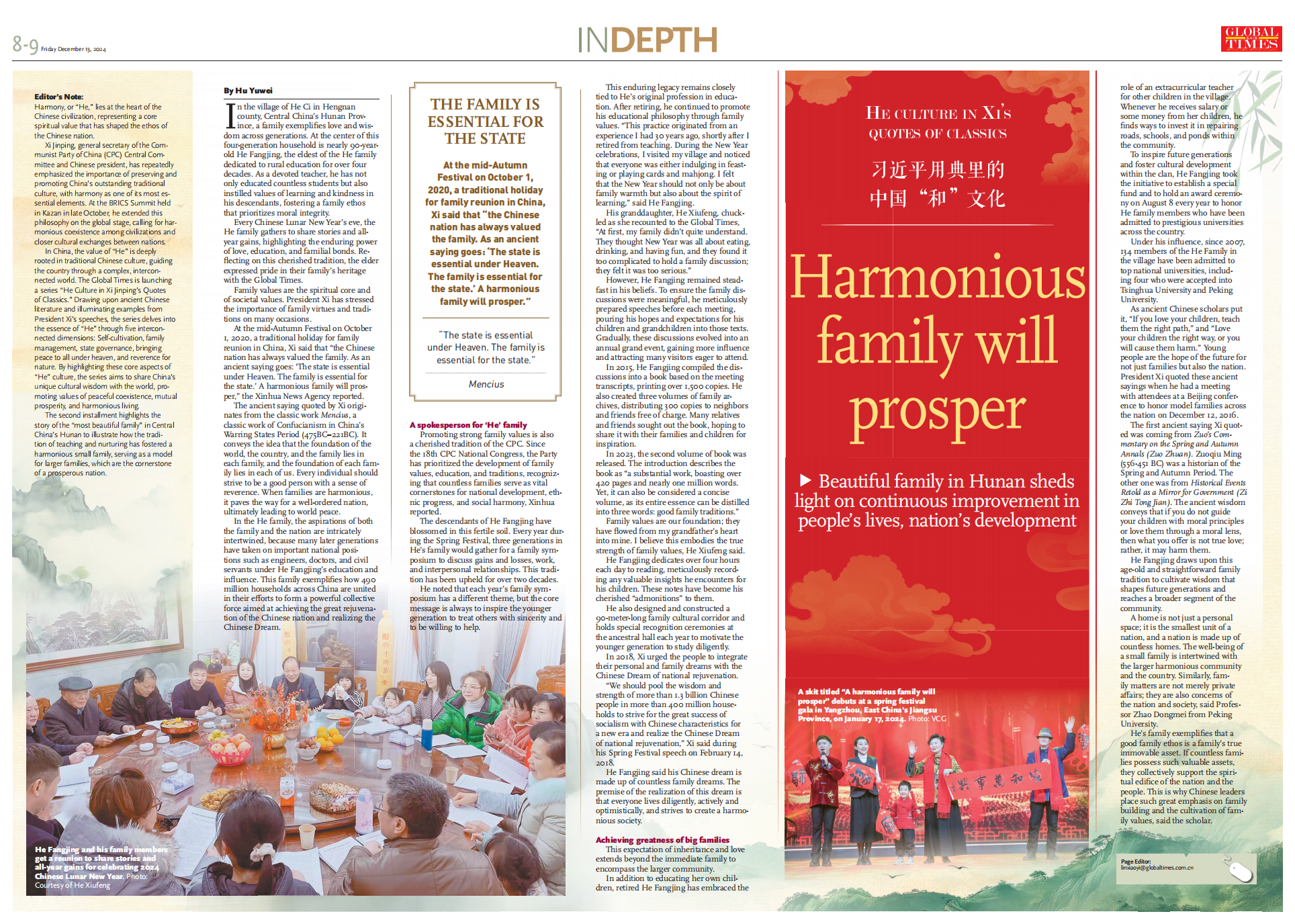 He's family exemplifies that a good family ethos is a family's true immovable asset. If countless families possess such valuable assets, they collectively support the spiritual edifice of the nation and the people. This is why Chinese leaders place such great emphasis on family building and the cultivation of family values, said the scholar.