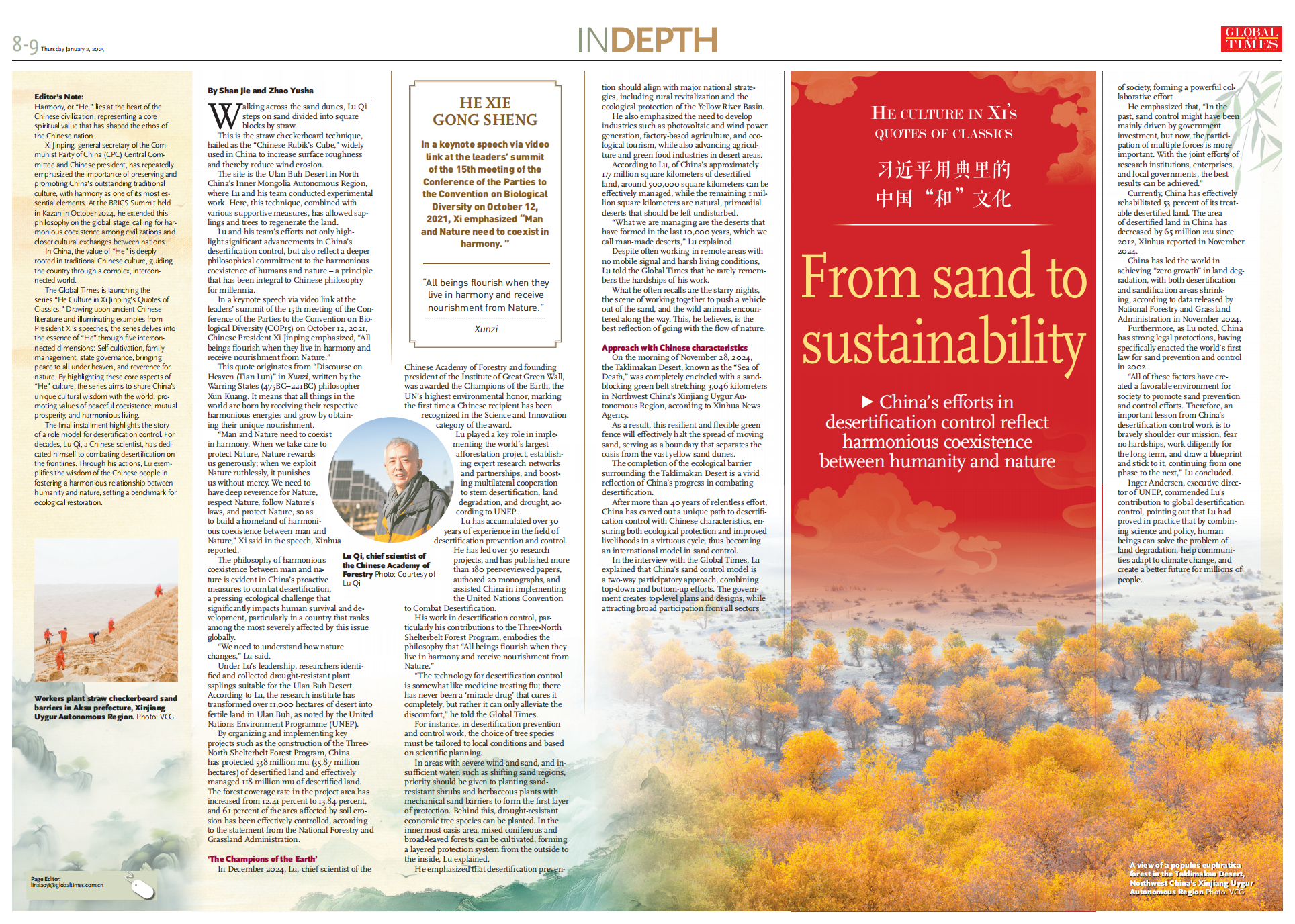 Editor's Note: Harmony, or "He," lies at the heart of the Chinese civilization, representing a core spiritual value that has shaped the ethos of the Chinese nation.Xi Jinping, general secretary of the Communist Party of China (CPC) Central Committee and Chinese president, has repeatedly emphasized the importance of preserving and promoting China's outstanding traditional culture, with harmony as one of its most essential elements. At the BRICS Summit held in Kazan in October 2024, he extended this philosophy on the global stage, calling for harmonious coexistence among civilizations and closer cultural exchanges between nations.In China, the value of "He" is deeply rooted in traditional Chinese culture, guiding the country through a complex, interconnected world. The Global Times is launching the series "He Culture in Xi Jinping's Quotes of Classics." Drawing upon ancient Chinese literature and illuminating examples from President Xi's speeches, the series delves into the essence of "He" through five interconnected dimensions: Self-cultivation, family management, state governance, bringing peace to all under heaven, and reverence for nature. By highlighting these core aspects of "He" culture, the series aims to share China's unique cultural wisdom with the world, promoting values of peaceful coexistence, mutual prosperity, and harmonious living.The final installment highlights the story of a role model for desertification control. For decades, Lu Qi, a Chinese scientist, has dedicated himself to combating desertification on the frontlines. Through his actions, Lu exemplifies the wisdom of the Chinese people in fostering a harmonious relationship between humanity and nature, setting a benchmark for ecological restoration.Walking across the sand dunes, Lu Qi steps on sand divided into square blocks by straw.