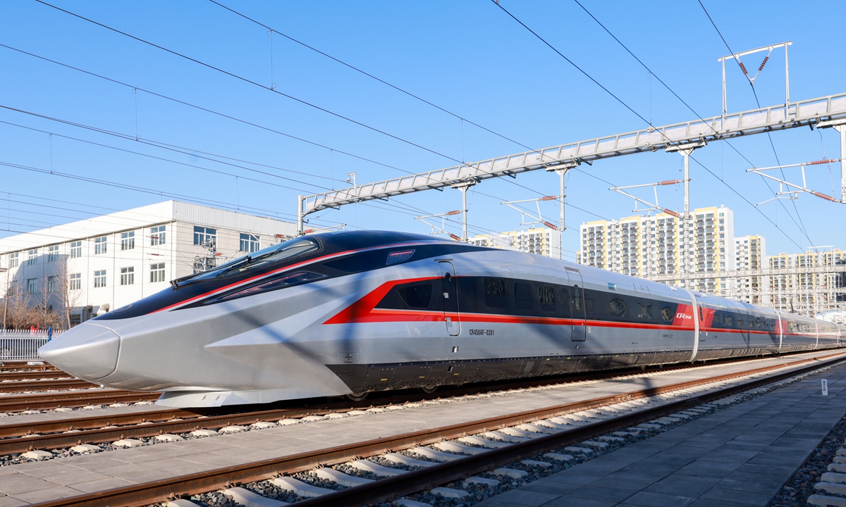 On December 29, 2024, China's cutting-edge rail technology once again amazed the world as the country unveiled the prototype of the world's fastest high-speed train, the CR450. The new model has reached test speeds as high as 450 kilometers per hour and has an operational speed of 400 kilometers per hour. Currently, the highest speed of the CR400 Fuxing bullet trains in service in China is 350 kilometers per hour, according to Xinhua.