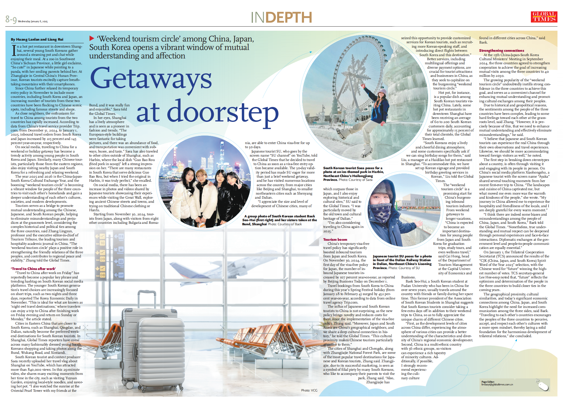 In a hot pot restaurant in downtown Shanghai, several young South Koreans gather around a steaming pot and chat while enjoying their meal. At a zoo in Southwest China's Sichuan Province, a little girl exclaims, "So cute!" in Japanese while pointing to a panda, with her smiling parents behind her. At Zhangjiajie in Central China's Hunan Province, Korean tourists excitedly capture breathtaking mountains with their smartphones.