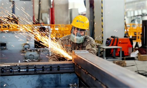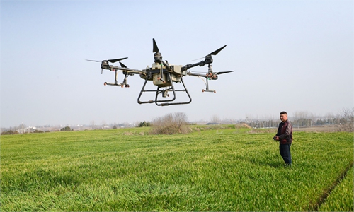 A piece of equipment integrating watering and fertilizing irrigates winter wheat in a field of Xinye county in Central China's Henan Province on January 16, 2025. With the support of smart technology, the county's farms have achieved significant water-saving benefits, with a water-saving rate of 48 percent. Photo: VCG