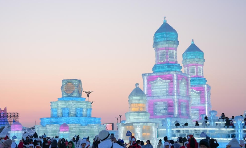 People visit the Harbin Ice-Snow World in Harbin, northeast China's Heilongjiang Province, Jan. 23, 2025. As of 10 p.m. Sunday, the bustling Harbin Ice-Snow World had received more than 2 million visitors since it opened on Dec. 21, 2024. As the city's iconic landmark, the Harbin Ice-Snow World, with this year's edition, the largest in its history, boasts 1 million square meters, up from last year's 800,000 square meters. More than 300,000 cubic meters of ice and snow were used in its construction. (Xinhua/Wang Jianwei)