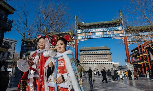 Tourists pass by the front of the Zhengyangmen Archery Tower in the center of Beijing on December 26, ...