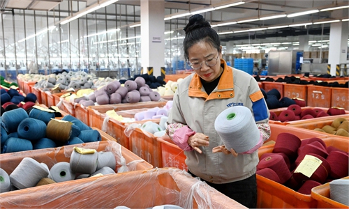 A worker is busy assembling wind turbine towers at a factory in Lianyungang, East China's Jiangsu Province on February 5, 2025. Businesses have resumed work and production following the Spring Festival holidays, striving for a strong start to the new year. In 2024, the nation's installed capacity of wind and solar power surpassed 1.4 billion kilowatts for the first time. Photo: VCG