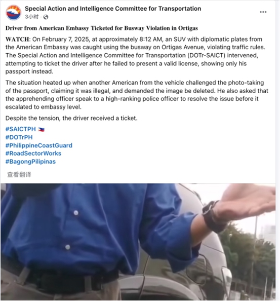 The driver of an SUV with US Embassy diplomatic plates was issued a ticket by traffic police for illegally passing through the EDSA Busway along Ortigas Avenue in Manila on Friday morning. The Philippine Department of Transportation-Special Action and Intelligence Committee for Transportation (DOTr-SAICT) said the American driver failed to present a valid license and showed his passport instead, Philippine media outlet GMA Network reported.