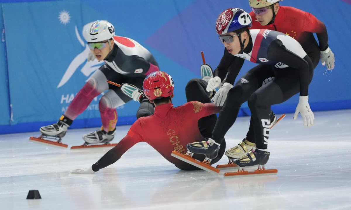 Sun Long (2nd L) of China falls down during the men's 1000m final match of the short track speed skating event at the 9th Asian Winter Games in Harbin, northeast China's Heilongjiang Province, Feb. 9, 2025. (Xinhua/Yan Linyun)