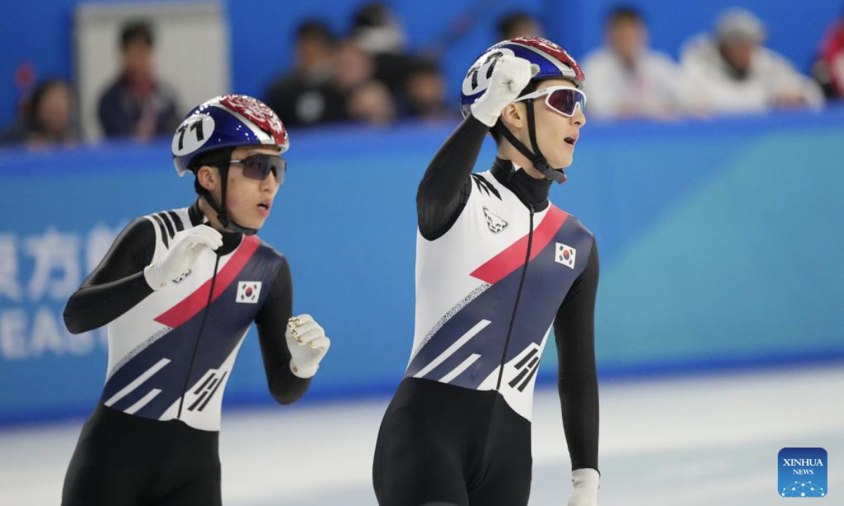 Jang Sungwoo (R) and Park Jiwon of South Korea react after the men's 1000m final match of the short track speed skating event at the 9th Asian Winter Games in Harbin, northeast China's Heilongjiang Province, Feb. 9, 2025. (Xinhua/Yan Linyun)