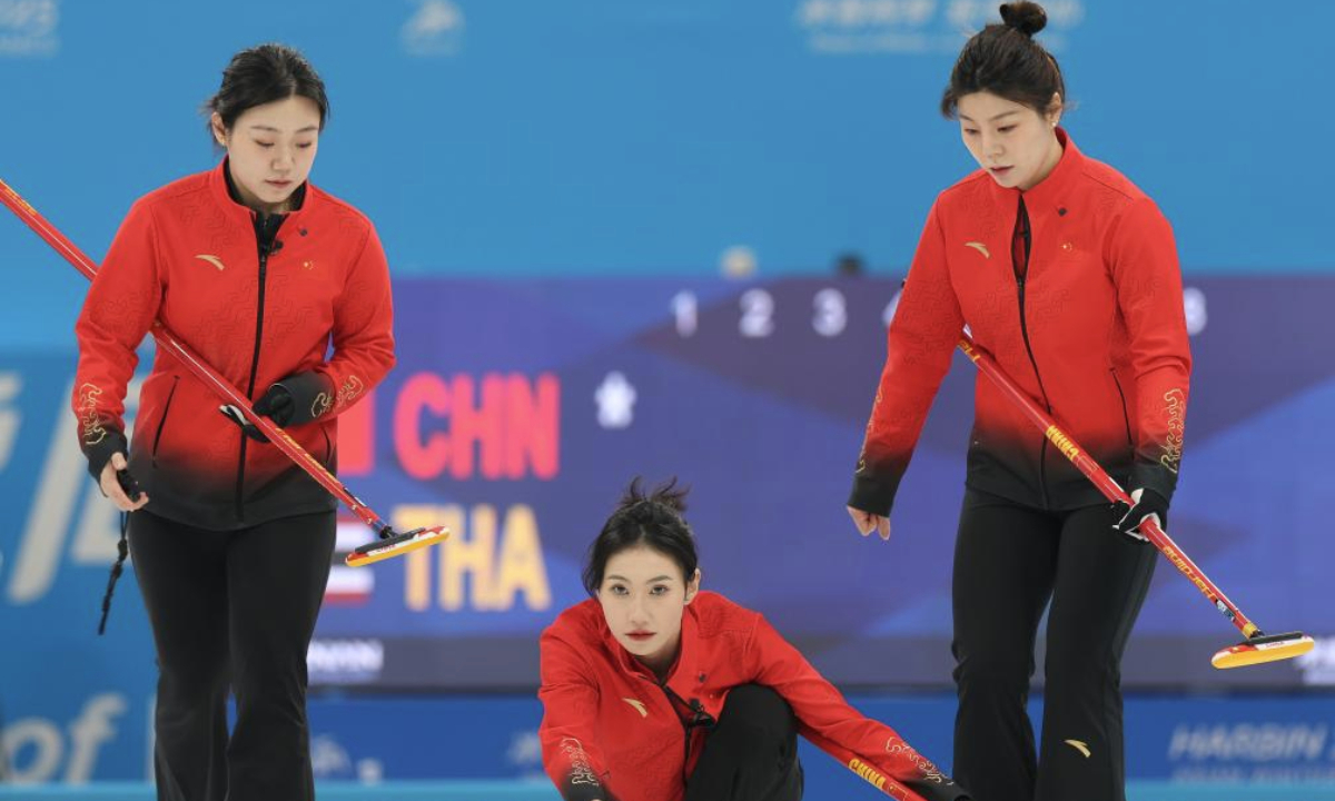 Wang Rui(C) of China competes during the Women's Round Robin Session 1 match between China and Thailand of the curling event at the 9th Asian Winter Games in Harbin, northeast China's Heilongjiang Province, Feb. 9, 2025. (Xinhua/Hu Xingyu)