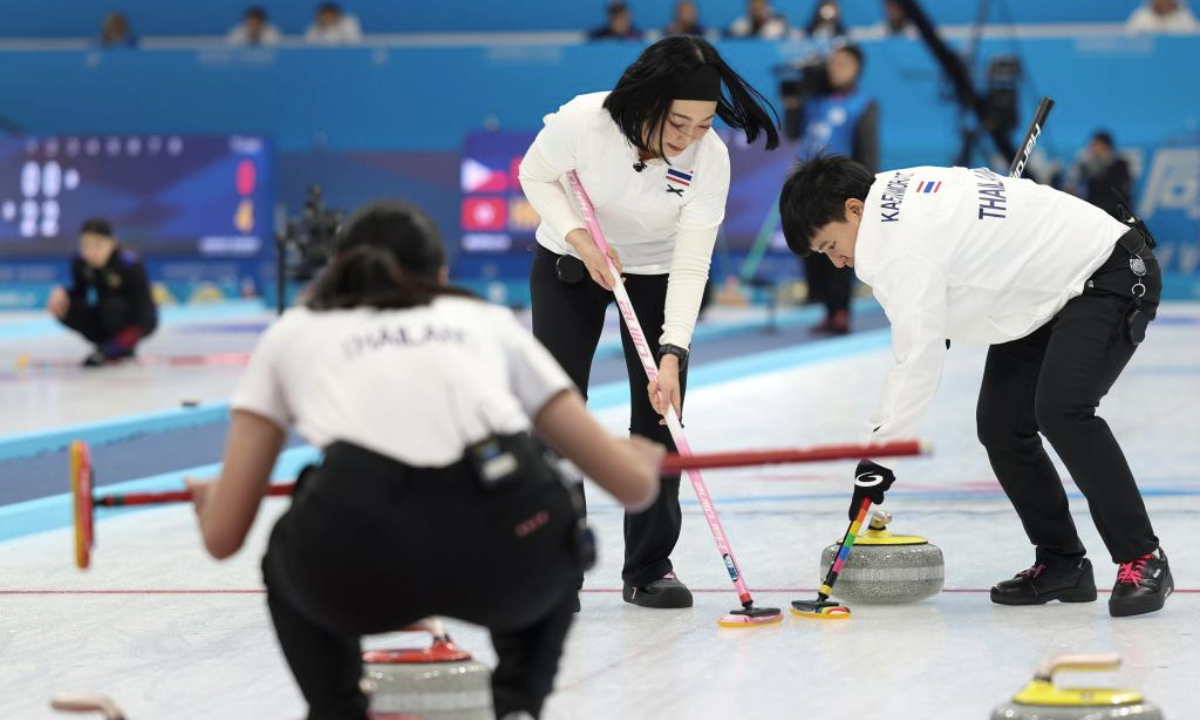 Kanya Natchanarong(C) and Supakan Kaewmorakot (R) of Thailand compete during the Women's Round Robin Session 1 match between China and Thailand of the curling event at the 9th Asian Winter Games in Harbin, northeast China's Heilongjiang Province, Feb. 9, 2025. (Xinhua/Hu Xingyu)