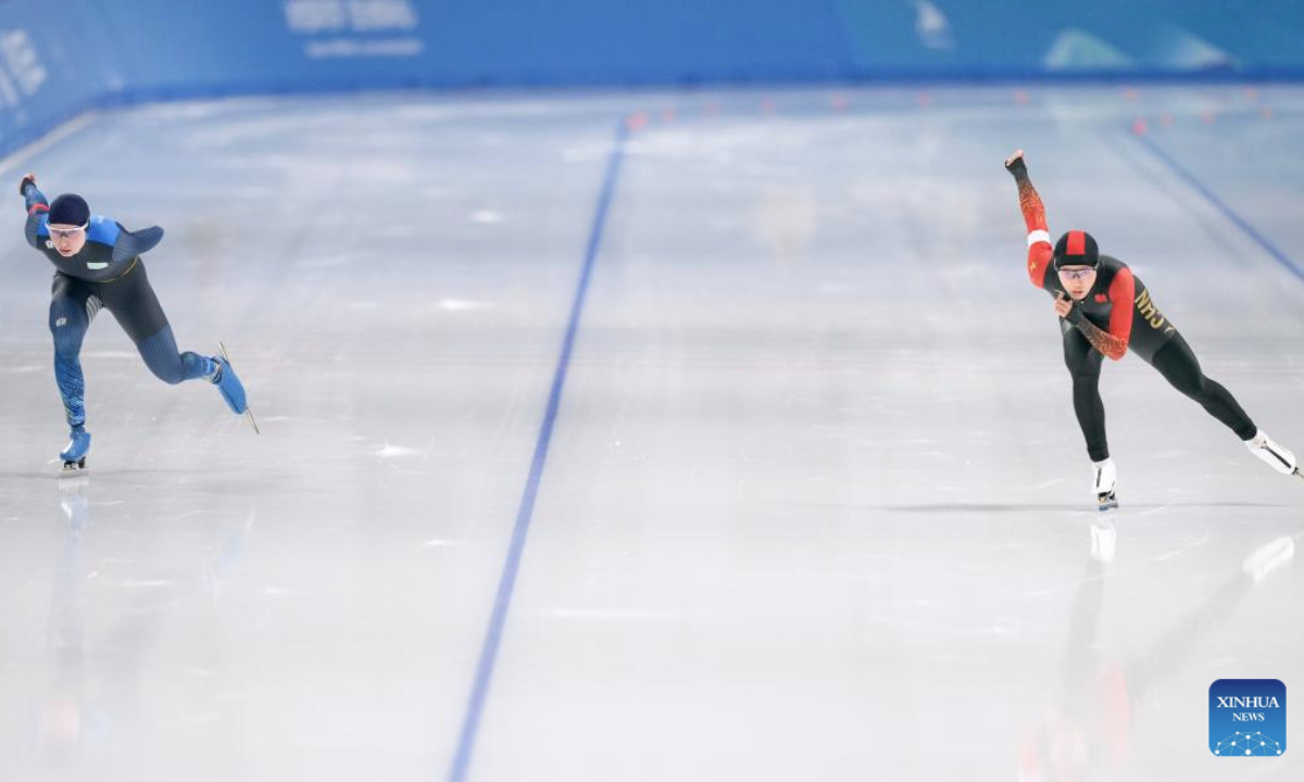 Yang Binyu of China competes during the women's 3000m final match of the speed skating event at the 9th Asian Winter Games in Harbin, northeast China's Heilongjiang Province, Feb. 10, 2025. (Xinhua/Li Yibo)