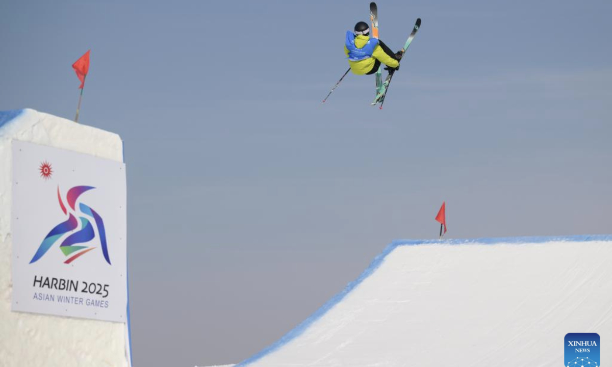 Lin Hao of China competes during the Freestyle Skiing men's freeski slopestyle final at the 9th Asian Winter Games in Yabuli, northeast China's Heilongjiang Province, Feb. 11, 2025. (Xinhua/Mu Yu)