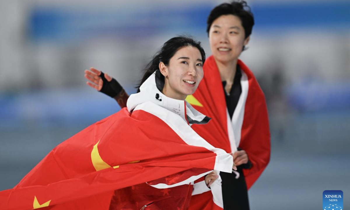 Han Mei (L) and Yin Qi of China celebrate after the women's 1000m final match of the speed skating event at the 9th Asian Winter Games in Harbin, northeast China's Heilongjiang Province, Feb. 11, 2025. (Xinhua/Chen Zhenhai)