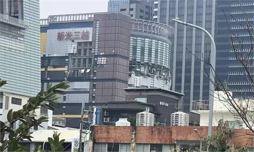 Workers look toward a damaged department store following a suspected gas explosion in Taichung, China's Taiwan island, on February 13, 2025. As of 4 pm, the casualty toll from the explosion was four deaths and 26 injured with varying degrees of severity, CCTV reported. Photo: VCG