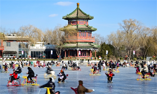 Local residents and tourists ride ice sleds at the Shichahai Rink in the Xicheng district of Beijing, capital ...