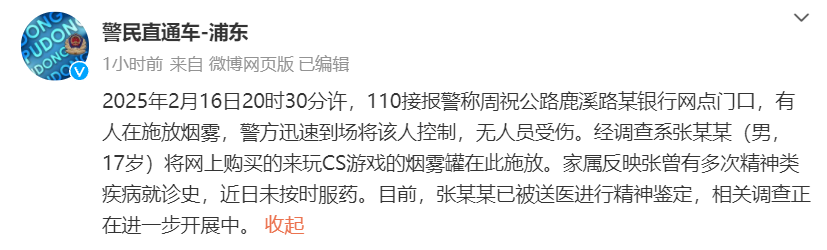 Upon investigation, it was found that the person, surnamed Zhang (male, 17 years old), had ignited smoke canisters purchased online for playing CS games at the entrance. According to his family members, Zhang had a history of multiple psychiatric consultations and had not been taking his medication as prescribed recently, said the release.