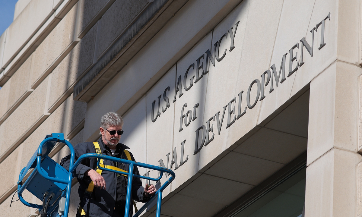 A worker removes the US Agency for International Development (USAID) sign on the entrance of the agency's headquarters on February 7, 2025, in Washington, DC, the US. Photo: VCG