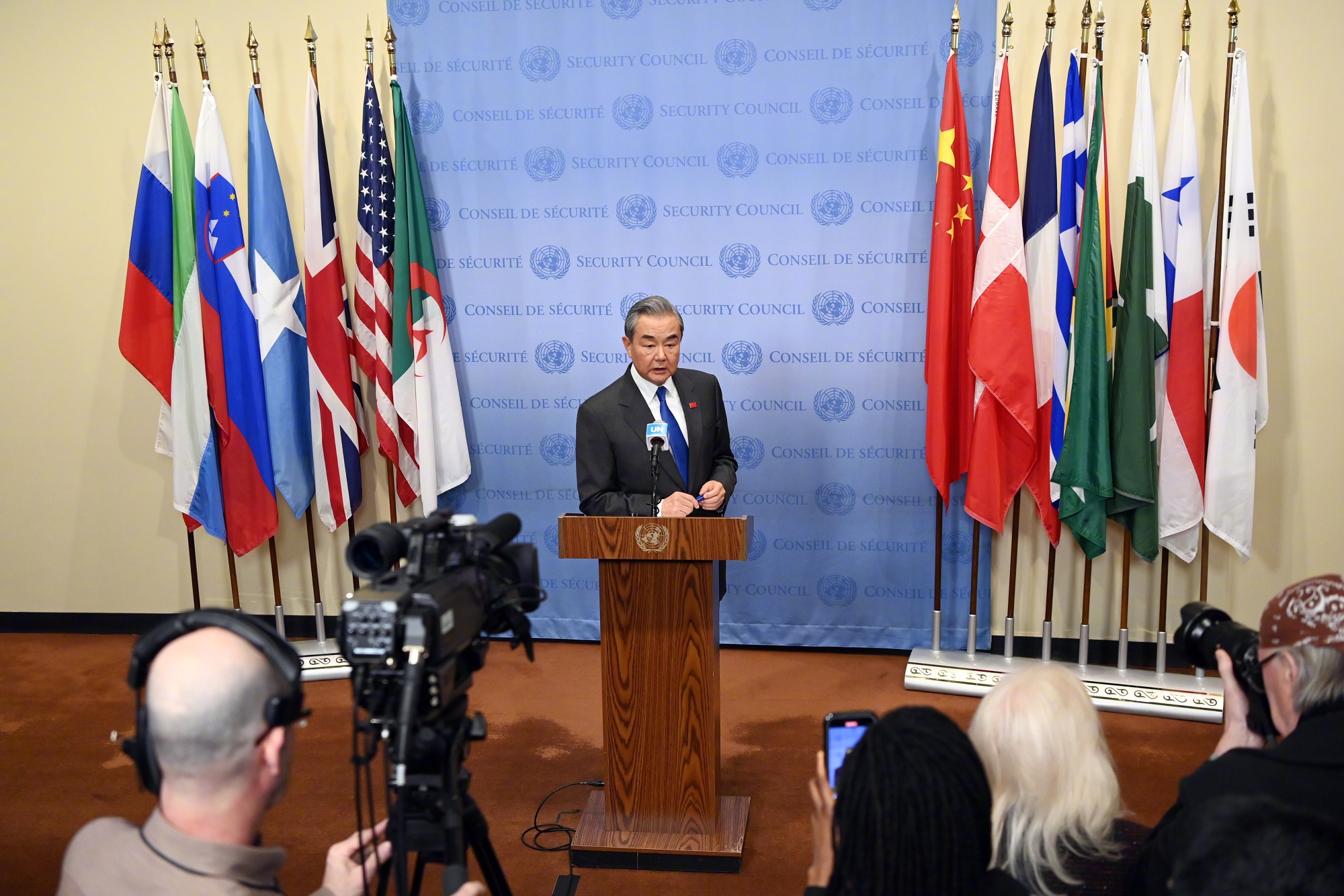 Chinese Foreign Minister Wang Yi speaks to the media after chairing a high-level UN Security Council meeting on "Practicing Multilateralism, Reforming and Improving Global Governance" in New York on February 18, 2025. Photo: Chinese Foreign Ministry.
