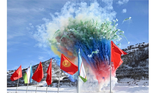 Fireworks explode behind state flags during the commencement ceremony of the China-Kyrgyzstan-Uzbekistan railway project in Kyrgyzstan on December 27, 2024. Photo: VCG