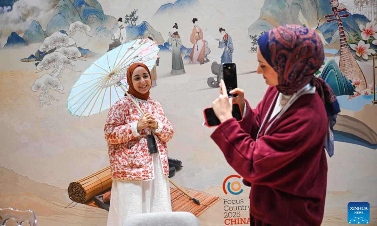 A visitor poses for photos in the China section of the 10th Istanbul Publishing Fellowship in Istanbul, Türkiye, Feb. 25, 2025. The event kicked off here on Tuesday, with China selected as the "Focus Country" for the event. In the China section, visitors were captivated by a diverse array of Chinese books, with representatives from various Chinese publishing houses showcasing their collections and engaging in meetings to enhance collaboration. (Xinhua/Liu Lei)